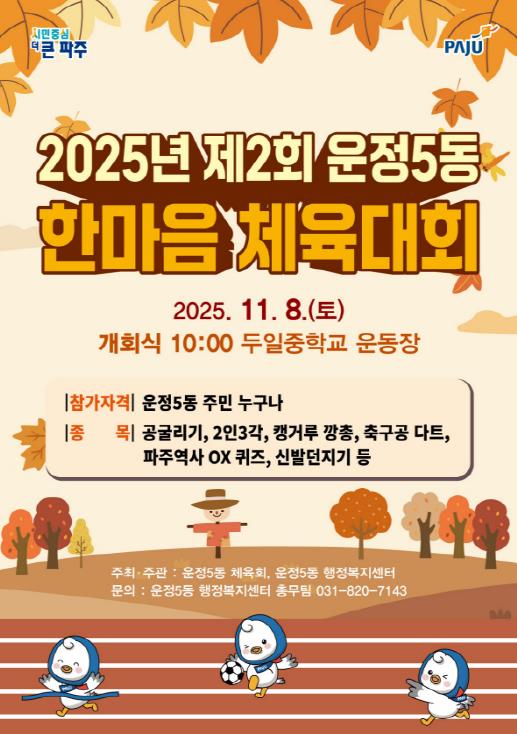 이번 행사는 운정5동체육회와 운정5동이 공동으로 주최·주관하며, 주민의 건강 증진과 화합을 도모하고, 활기찬 지역공동체 분위기를 조성하기 위해 마련됐다.