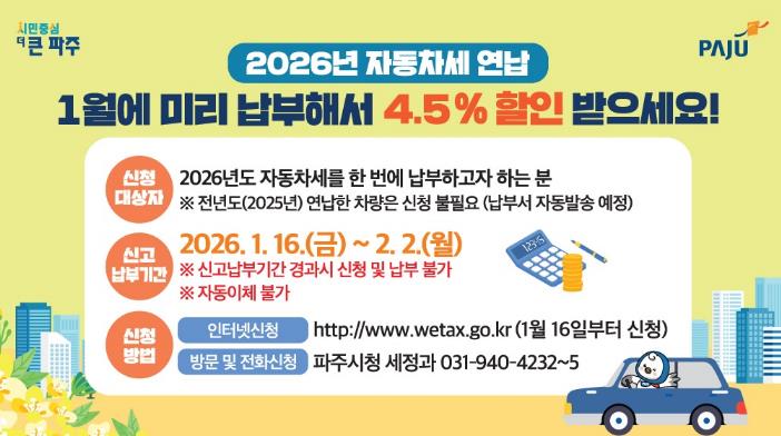 파주시 관계자는 “자동차세 연납은 1월에 납부할수록 절세 효과가 크다”라며, “납기 말일인 2월 2일 이후에는 납부가 불가능한 만큼 납세자께서는 기한 내 미리 납부해 주시길 바란다”라고 말했다.