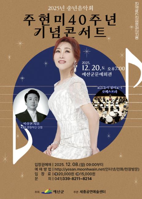 [메이저뉴스]예산군문예회관은 2025년 송년을 맞아 오는 12월 20일 오후 7시 ‘트롯 여제’ 주현미의 데뷔 40주년을 기념하는 콘서트를 개최한다.