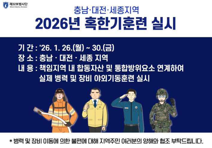[메이저뉴스]육군 제32보병사단은 오는 1월 26일부터 30일까지 충남ㆍ대전ㆍ세종 지역에서 동계 통합 방위 작전 확립을 위한 혹한기 훈련을 진행한다.