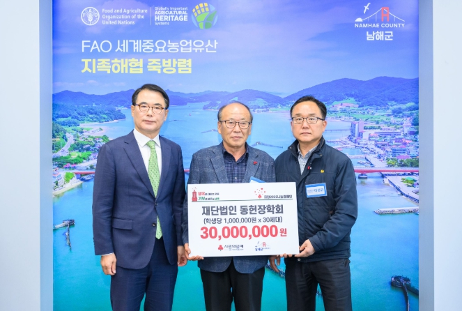 [메이저뉴스]남해군은 지난 2일 재단법인 동헌장학회(회장 강진용)가 저소득층 학생들을 위한 장학금 3천만원을 기탁했다고 밝혔다.