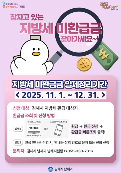 [메이저뉴스] 김해시는 납세자가 돌려받을 지방세 환급금을 제때 찾아갈 수 있도록 11~12월 ‘2025 지방세 미환급금 일제정리 기간’을 운영한다고 31일 밝혔다.