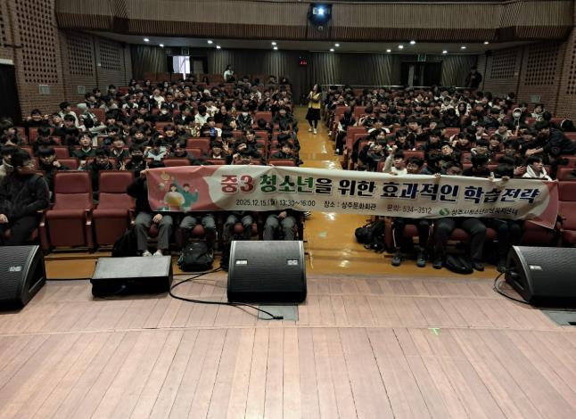 이번 중3 전환기 프로그램은 고등학교 내신 학습법, 과목별 학습법, 공부 방향성 설정을 주제로 메가스터디 교육연구소 강사들의 강연으로 진행됐으며, 관내 6개 중학교 415명이 참여했다.