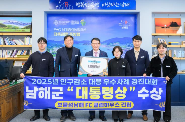[메이저뉴스] 남해군이 행정안전부가 주관한 ‘2025년 지자체 인구감소 대응 우수사례 경진대회’에서 최고 우수 기초지자체로 선정돼 대통령상을 수상하는 영예를 안았다.
