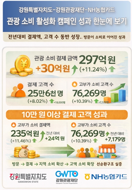 한편, 도와 재단은 이번 성과를 바탕으로 카드사·플랫폼과 연계한 관광 소비 활성화 캠페인을 지속 확대하고, 지역별 특성과 소비 패턴을 반영한 맞춤형 관광 마케팅을 추진해 강원 방문의 해 성과를 극대화할 계획이다.