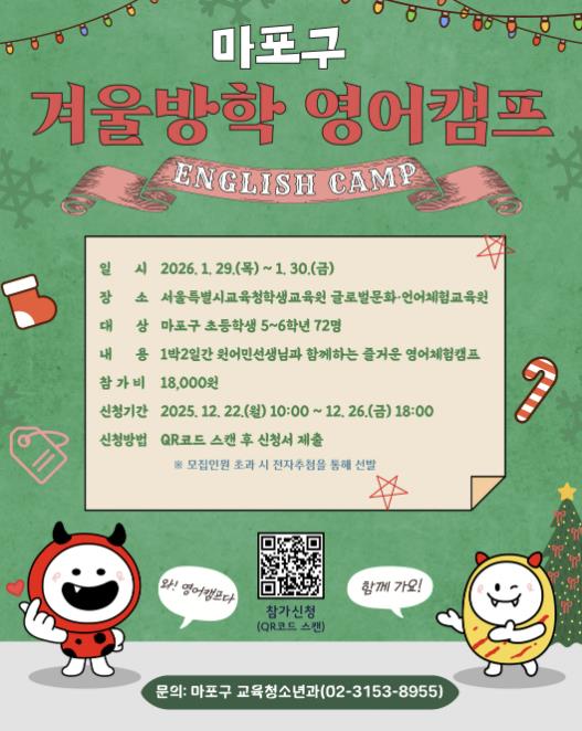 [메이저뉴스]마포구는 겨울방학을 맞아 관내 초등학교 5~6학년 학생 72명을 대상으로 2026년 1월 29일부터 30일까지 1박 2일 일정의 겨울방학 영어캠프를 운영한다.