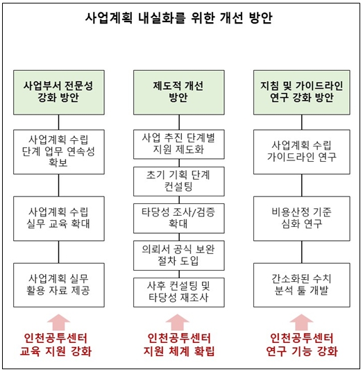 또한, 인천시 사업계획 내실화를 위한 개선방안과 인천공공투자관리센터의 단계별 지원 확대 방안으로, △사업부서의 전문성 강화, △제도적 개선, △지침 및 가이드라인 연구 강화 등을 제시했다.