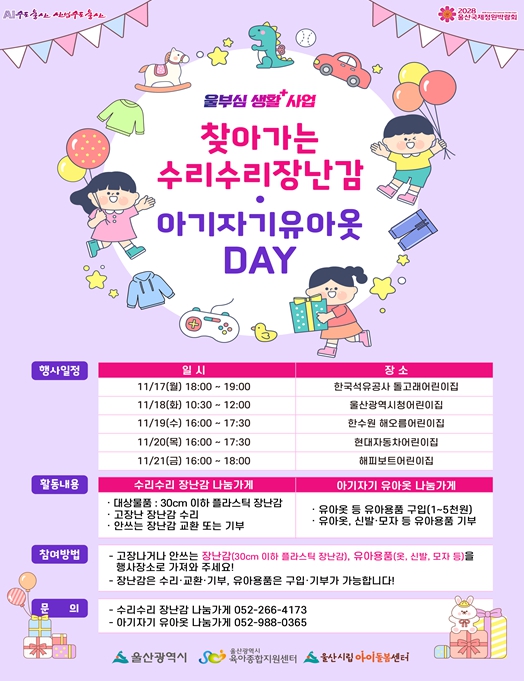 행사는 울산광역시육아종합지원센터가 주관하고 울산시립아이돌봄센터와 직장어린이집이 협력해 운영한다.