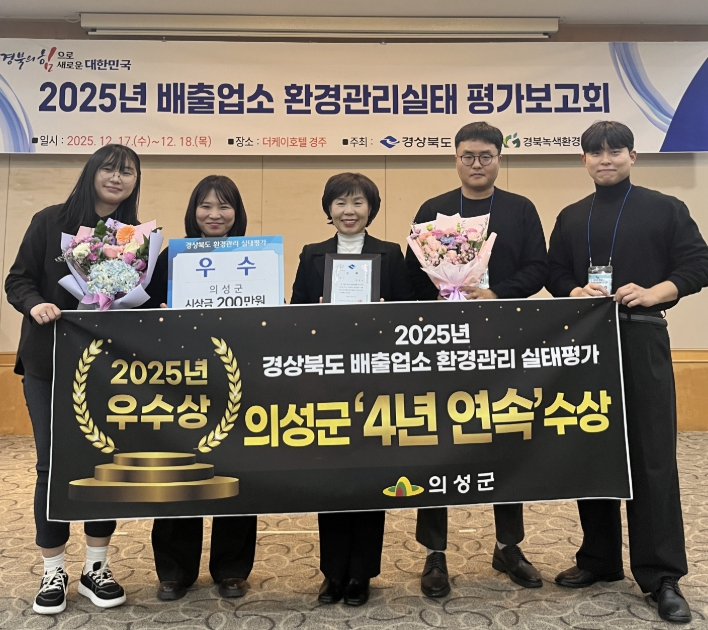 [메이저뉴스]의성군은 지난 12월 17일 열린 ‘2025년 경상북도 배출업소 환경관리 실태평가’에서 2그룹 1위를 차지하며 도 전체 우수상을 수상했다고 밝혔다.