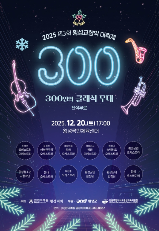 정재영 (사)한국예총 횡성지회장은 “지난 10월 강원예술인한마당에서 도내 오케스트라와 합창단이 함께한 ‘500인 강원클래식 대축전’의 성공적 무대에 이어 마련된 이번 공연은, 단순한 연주회를 넘어 청소년들이 음악으로 성장하고 지역사회가 그 과정을 함께 응원하는 자리”라며 “많은 군민들께서 함께해 따뜻한 박수로 연주자들을 격려해 주시길 바란다”고 말했다.