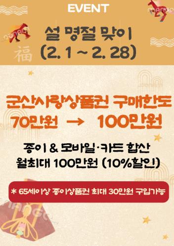 [메이저뉴스]군산시가 설 명절을 맞아 2월 한 달간 군산사랑상품권의 1인당 월 구매 한도를 기존 70만 원에서 100만 원으로 한시적으로 전격 상향한다고 26일 밝혔다.