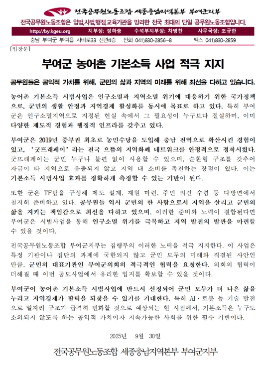[메이저뉴스]전국공무원노동조합 부여군지부는 지난 9월 30일 의견문을 통해, 부여군이 추진 중인 농어촌 기본소득 시범 사업을 적극적으로 지지하며, 군민과 함께 공모사업 유치에 최선을 다하겠다는 뜻을 밝혔다.