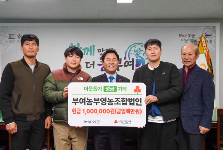 이에 군수는 “지속적인 나눔을 통해 지역사회에 모범을 보여주고 있는 부여 농부영농조합법인에 깊이 감사드린다.”라며, “기탁해 주신 성금은 꼭 필요한 이웃들에게 소중히 전달하겠다.”라고 전했다.