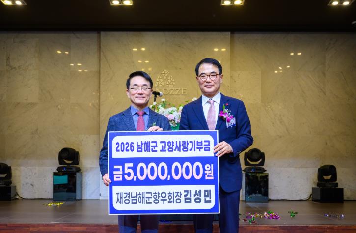 [메이저뉴스]재경남해군향우회 김성민 회장이 지난 6일 서울에서 열린 ‘2026년 재경향우회 신년하례회’에서 남해군의 발전을 위해 고향사랑기부금 500만 원을 기탁했다.
