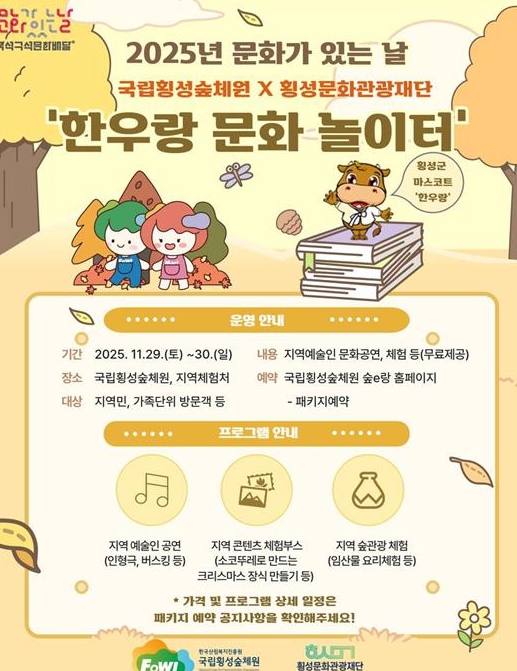 [메이저뉴스]산림청 한국산림복지진흥원국립횡성숲체원은 오는 11월 29일부터 30일까지 횡성 지역민 및 문화소외계층을 대상으로 ‘25년 강원특별자치도 문화가 있는 날 구석구석문화배달사업 – 한우랑 문화놀이터’를 개최한다고 밝혔다.