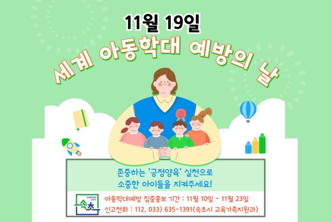 [메이저뉴스]속초시는 11월 19일 ‘세계 아동학대 예방의 날’을 맞아 아동권리 존중 인식을 확산하고 지역사회 내 아동학대 예방 분위기를 조성하기 위해 11월 10일부터 23일까지 아동학대 예방 집중홍보 기간을 운영한다.
