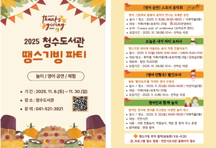 [메이저뉴스] 천안시 청수도서관은 오는 8~ 30일 ‘2025 땡스기빙 파티’를 연다고 6일 밝혔다.