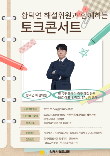 [메이저뉴스]김제시립도서관은 오는 14일 금요일 19시부터 도서관 5층 배움터 3에서 ‘황덕연 해설위원과 함께하는 토크콘서트 내 꿈을 읽는 도서관’을 진행한다고 밝혔다
