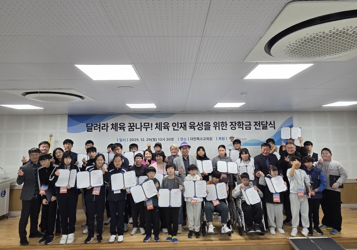[메이저뉴스]대전특수교육원은 12월 29일 본원과 한밭수목원 엑스포시민광장에서 장애학생 육상 종목 특기생과 미래 육상 꿈나무 63명을 대상으로 (재)조웅래나눔재단(이사장 조웅래)으로부터‘체육(육상) 종목 미래인재 장학금 전달식 및 달리기 행사’를 개최하고, 장학증서를 수여했다