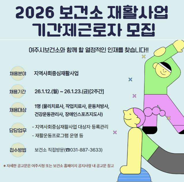 [메이저뉴스]여주시보건소는 지역 내 등록장애인과 예비장애인들의 건강관리를 위한 지역사회중심재활사업 추진을 위해 1월 12일부터 1월 23일까지 2주간 기간제근로자 채용 공고를 실시한다.