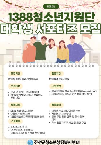 [메이저뉴스]충북 진천군청소년상담복지센터는 이달 24일부터 대학생 대상 서포터즈 프로그램 ‘2026년 1388청소년지원단 대학생 서포터즈’ 참가자를 모집한다고 밝혔다.