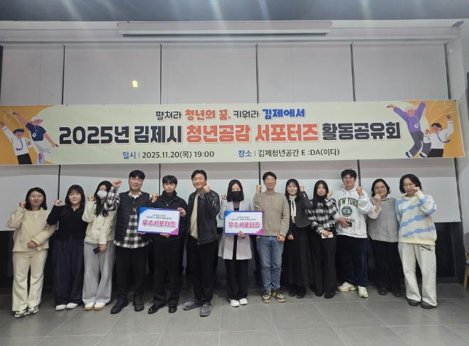 [메이저뉴스]김제시는 지난 20일, 김제 청년공간 E :DA(이다)에서'2025년 청년 서포터즈 활동공유회'를 개최하고, 올해 서포터즈가 추진한 정책 제안과 다양한 활동을 공유했다고 밝혔다.