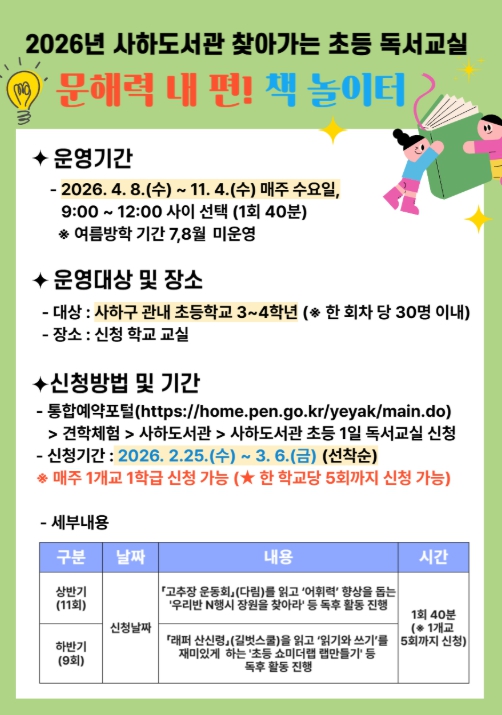 [메이저뉴스]부산시교육청 사하도서관은 4월부터 11월까지(7, 8월 제외) 사하구 관내 초등학교에서 3~4학년 학생을 대상으로 2026년 찾아가는 초등 독서교실 ‘문해력 내 편! 책 놀이터’를 운영한다.