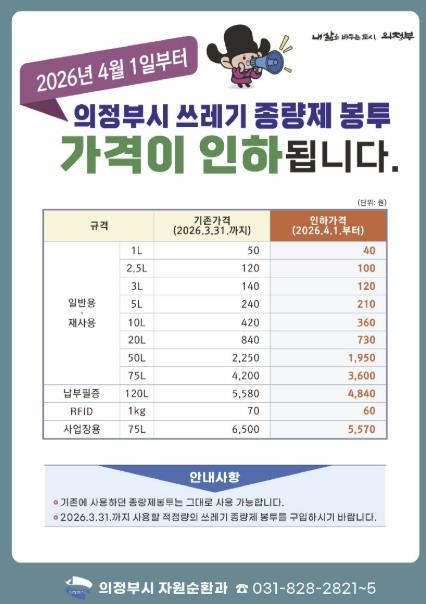 조 의원은 “지난 6개월 넘게 추진해 온 종량제 봉투 가격 인하가 지난해 12월 22일 '의정부시 폐기물 관리 조례' 수정 가결로 결실을 맺었다”며, 오는 4월 1일부터 새로운 가격이 시행될 예정이라고 전했다.