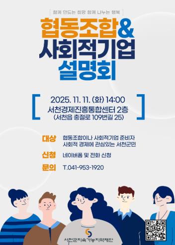[메이저뉴스](재)서천군지속가능지역재단은 오는 10월 20일 오후 2시, 서천경제진흥통합센터에서 ‘협동조합·사회적기업 설명회’를 연다.