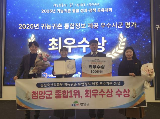[메이저뉴스]청양군은 농림축산식품부가 주관한 2025년 귀농귀촌 통합정보 제공 우수 시·군 평가에서 전국 1위를 차지하며 최우수상을 수상했다고 18일 밝혔다.
