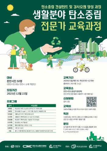 [메이저뉴스] 천안시 탄소중립지원센터는 내년 1월 6~ 29일 천안SB플라자에서 ‘생활분야 탄소중립 전문가 교육과정’을 운영한다고 9일 밝혔다.
