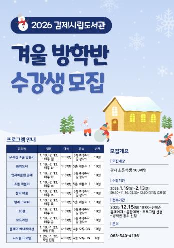 [메이저뉴스]김제시립도서관은 겨울방학을 맞아 관내 초등학생을 대상으로 겨울 독서교실과 겨울 방학반 프로그램을 오는 2026년 1월 12일부터 2월 13일까지 운영한다고 밝혔다