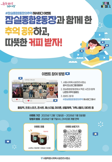 [메이저뉴스]서울시 체육시설관리사업소는 잠실종합운동장에서 시민이 경험한 다양한 추억과 기억을 수집하기 위한 SNS 이벤트 '#잠실종합운동장의 추억 해시태그 이벤트'를 2026년 1월 5일까지 진행한다고 밝혔다.