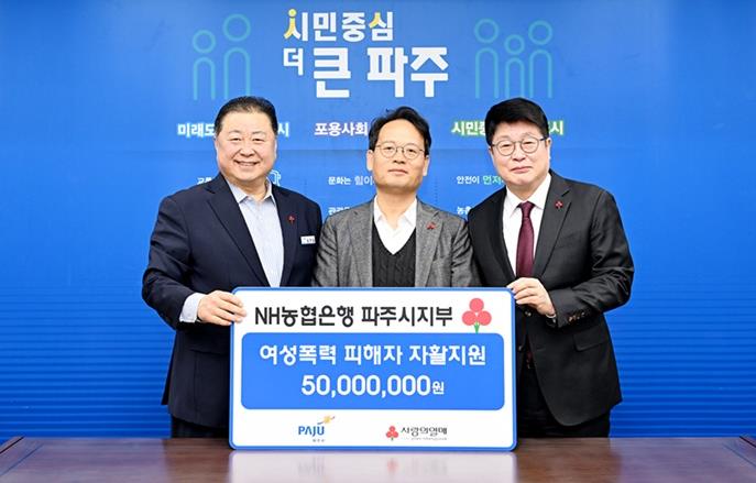 [메이저뉴스]파주시는 지난 11일 엔에이치(NH)농협은행 파주시지부가 여성폭력 피해자의 자립과 회복을 지원하기 위한 후원금 5천만 원을 기탁했다고 밝혔다.