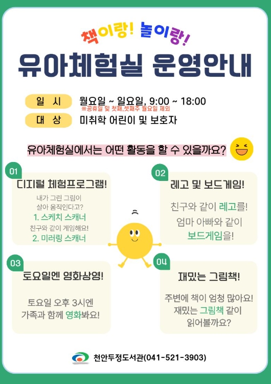 [메이저뉴스]천안시 두정도서관은 미취학 아동을 위한 ‘놀이 기반 독서 환경’인 유아체험실을 운영해 주민들로부터 호응을 얻고 있다고 12일 밝혔다.
