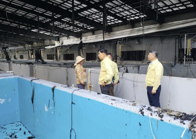 ▲ 보성군 꼬막 등 종묘배양장 화재, 인명 피해 없이 진화 완료_김철우 보성군수가 현장에서 피해 상황을 점검하고 있다. |