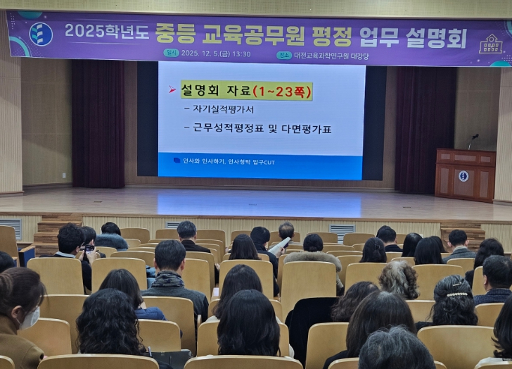 [메이저뉴스]대전시교육청은 12월 5일, 8일 양일간 대전교육과학연구원에서 중·고·각종·특수학교 교감과 교사, 교육전문직원을 대상으로 2025학년도 중등 교육공무원 평정 업무 설명회를 개최했다.