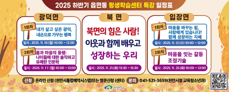 [메이저뉴스] 천안시는 이달 10일부터 다음 달 25일까지 ‘2025년 하반기 읍면동평생학습센터 인문학 특강’을 운영한다고 3일 밝혔다.