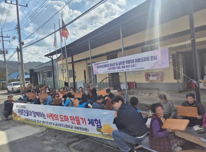 이날 금산여고 동아리 '어바웃타운' 청소년 8명이 참여해 주민 40여 명과 함께 남이면 역평1리 경로당에서 도마 만들기 체험을 진행하고 마을에 노후화된 평상을 직접 디자인한 등받이 평상으로 교체했다.