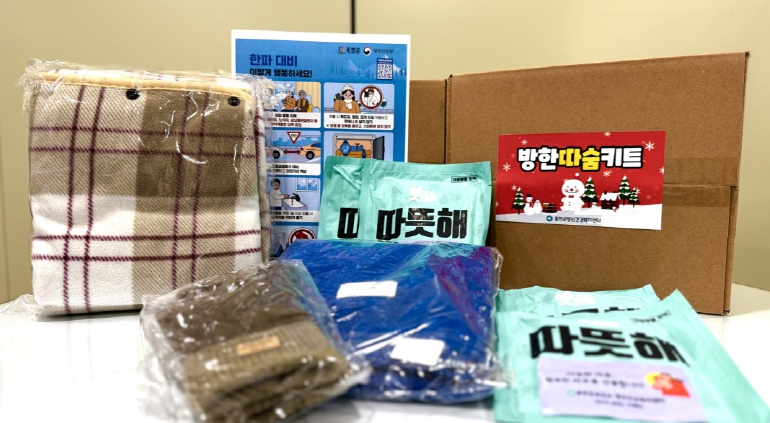 한랭질환 예방 “방한 따숨 키트”는 핫팩, 무릎담요, 장갑, 한파 시 행동요령 안내문 등 한파에 대응할 수 있는 실질적인 물품으로 구성했다.