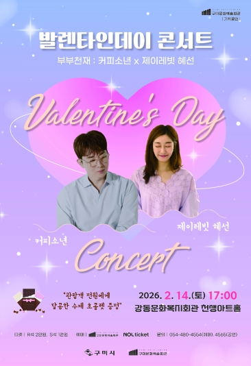 [메이저뉴스]구미시는 오는 2월 14일 오후 5시, 강동문화복지회관 천생아트홀에서 발렌타인데이 콘서트〈부부천재 : 커피소년 x 제이레빗 혜선〉을 개최한다.