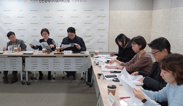 | ▲ 인천시사회서비스원은 최근 2026년 연구과제 선정을 위한 연구심의위원회를 열고 참석 위원들과 자료를 검토하고 있다. |