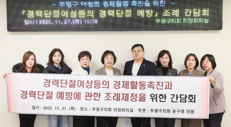 [메이저뉴스]인천 부평구의회는 지난 27일 의회 의정회의실에서 윤구영 의원(국민의힘, 삼산2동, 부개2ㆍ3동)이 대표발의한 '인천광역시부평구 경력단절여성등의 경제활동 촉진과 경력단절 예방에 관한 조례'제정을 위한 간담회를 진행했다.
