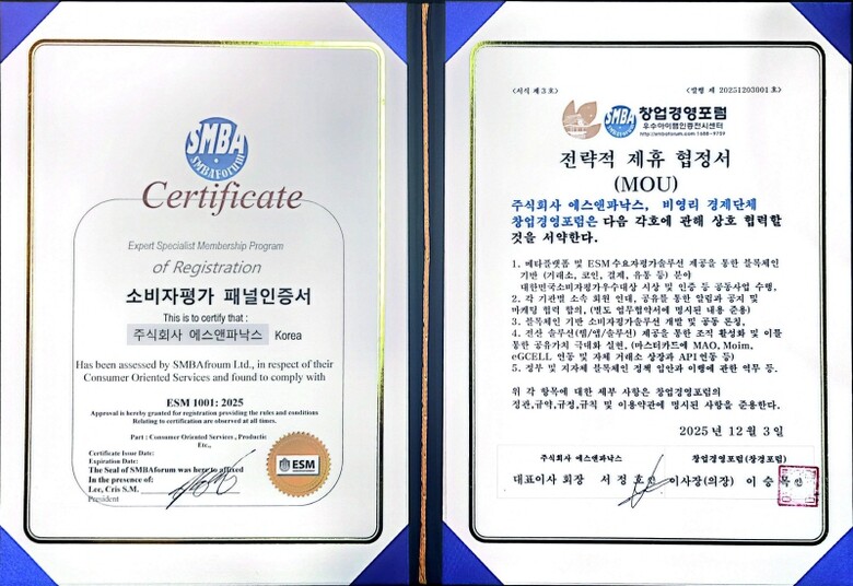 또한12월3일.(주)에스앤파낙스(서정호대표)는 대한민국 소비자평가단체창업경영포럼과 전략적제휴 및우수기업으로 인증 받으며 글로벌 시장으로 발돋움하는계기를 마련했다.