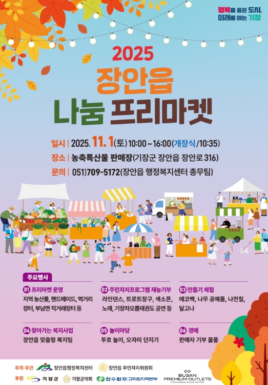 [메이저뉴스] 기장군 장안읍은 풍요로운 가을을 맞아 오는 11월 1일(토) 농축특산물 판매장(장안읍 장안로 316)에서 장안읍 주민자치위원회 주관으로 자연과 문화가 함께하는 2025년 ‘장안읍 나눔 프리마켓’을 개최한다고 31일 밝혔다.