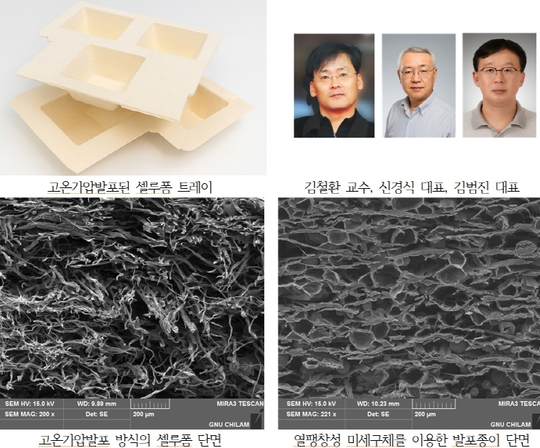 [메이저뉴스]경상국립대학교 농업생명과학대 환경재료과학과 김철환 교수 연구팀은 셀룰로오스 섬유, 전분, 열팽창성 미세구체, 계면활성제 등을 조합해 고온가압발포 방식으로 제조하는 친환경 발포 포장재 ‘셀루폼(Cellufoam)’ 개발에 성공했다.