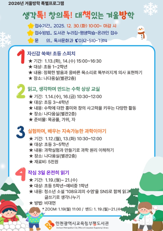 [메이저뉴스]인천광역시교육청부평도서관은 겨울방학을 맞아 1월 한달간 새 학년을 준비하는 초등학생과 중학생을 대상으로 겨울방학 특별프로그램을 운영한다.