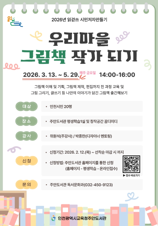 [메이저뉴스]인천광역시교육청주안도서관은 읽걷쓰 시민저자 양성을 위한 ‘우리마을 그림책 작가 되기’ 프로그램 참여자를 모집한다.