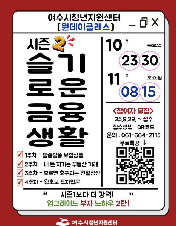 [메이저뉴스]여수시는 오는 10월 23일 오후 6시 30분 여수시청년지원센터에서 청년들의 금융 이해도 향상과 건전한 금융 습관 형성을 위한 무료 특강 ‘시즌2 슬기로운 금융생활’ 일일 강좌를 운영한다.