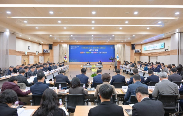 | ▲ 여수시는 지난 15일 시청 회의실에서 5급 이상 간부 공무원 70여 명이 참석한 가운데 2026년 주요업무 보고회를 개최했다. |
